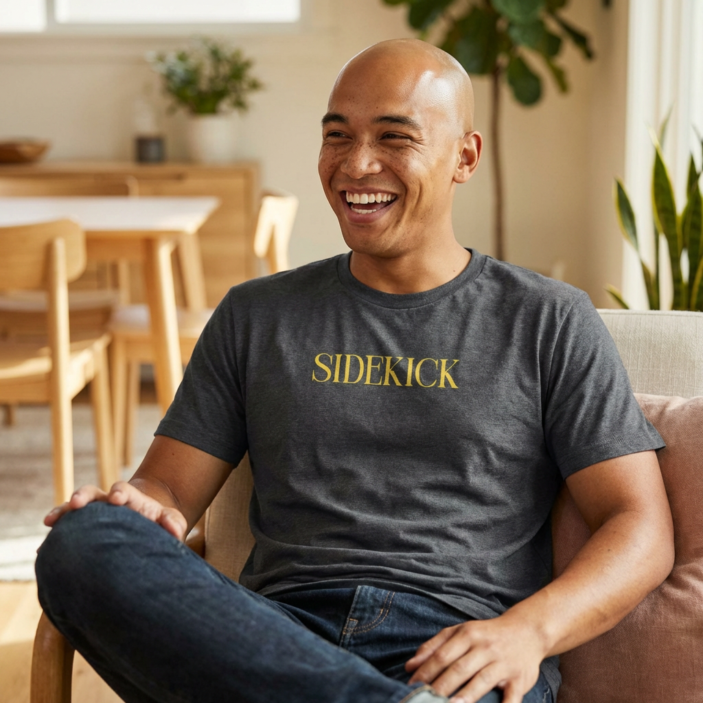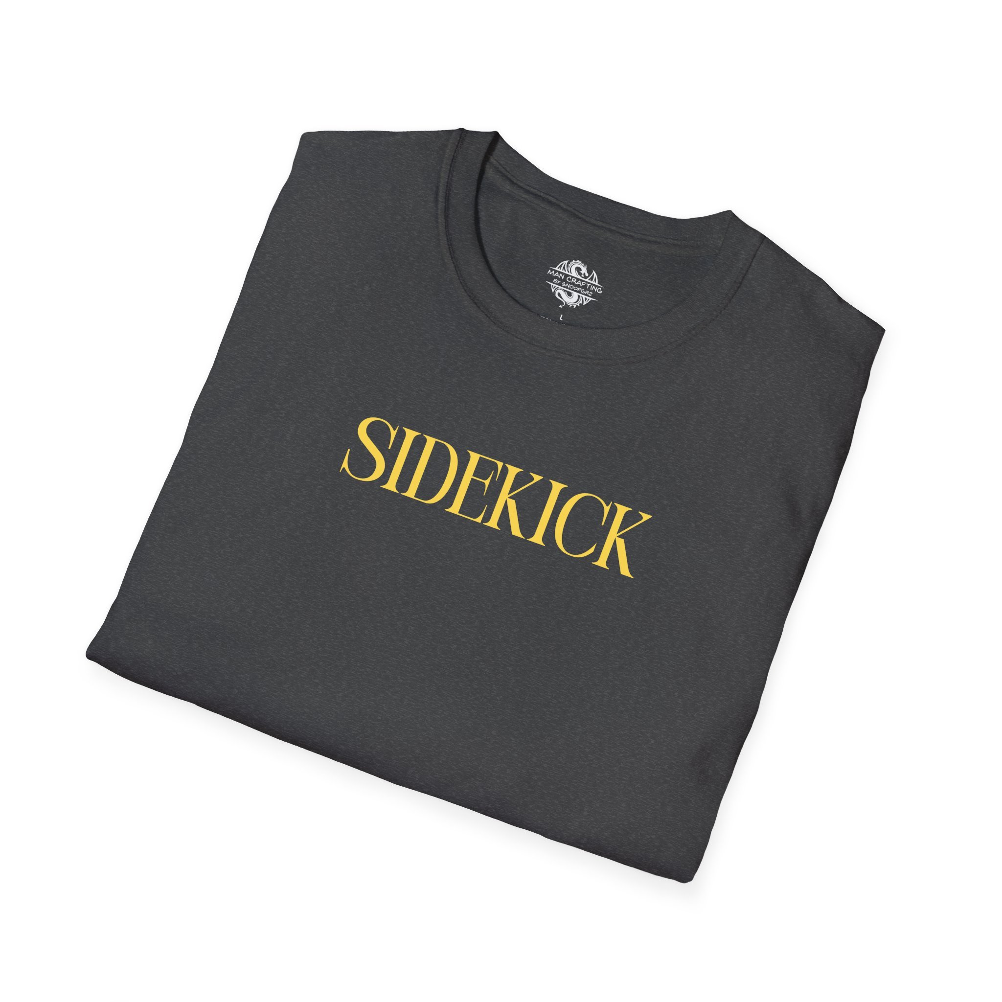Be the perky friend charcter in this soft Dark Heather colored t-shirt that proudly announces "Sidekick" in bold yellow text.